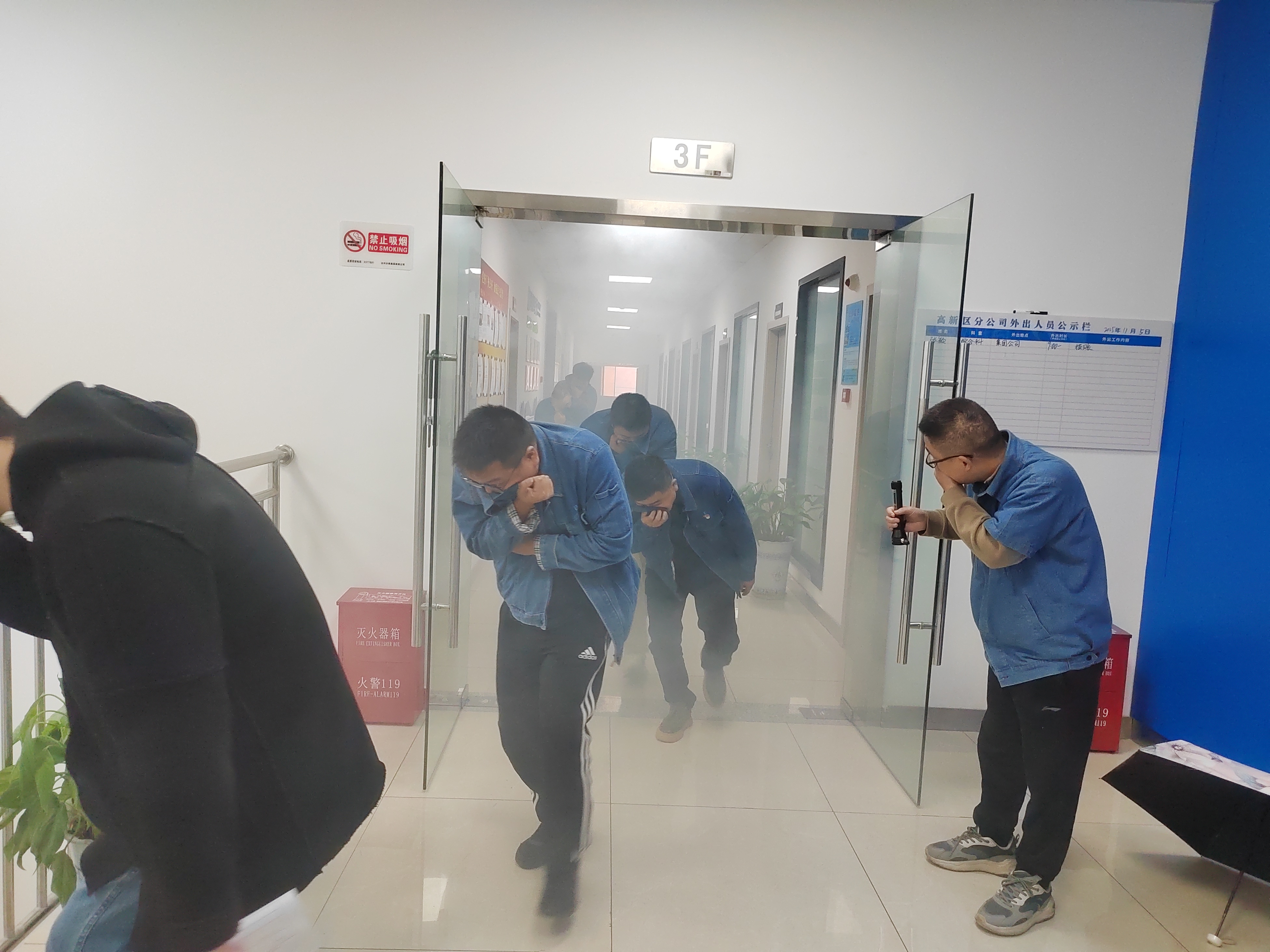 消防疏散演練模擬現場。警報聲響起,全體員工迅速行動,彎腰低頭、捂住口鼻,按預定路線有條不紊穿過“火災煙霧現場”。整個過程中,員工嚴格遵守要求,冷靜應對,展現良好應急反應能力。